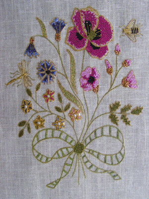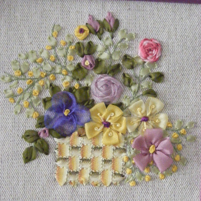 Kit rubans sur lin chiné imprimé. Rubans Mokuba.toutes fournitures comprises. 32 € + 4.32 frais d'envoi, à commander sur cathy.acloque@free.fr
